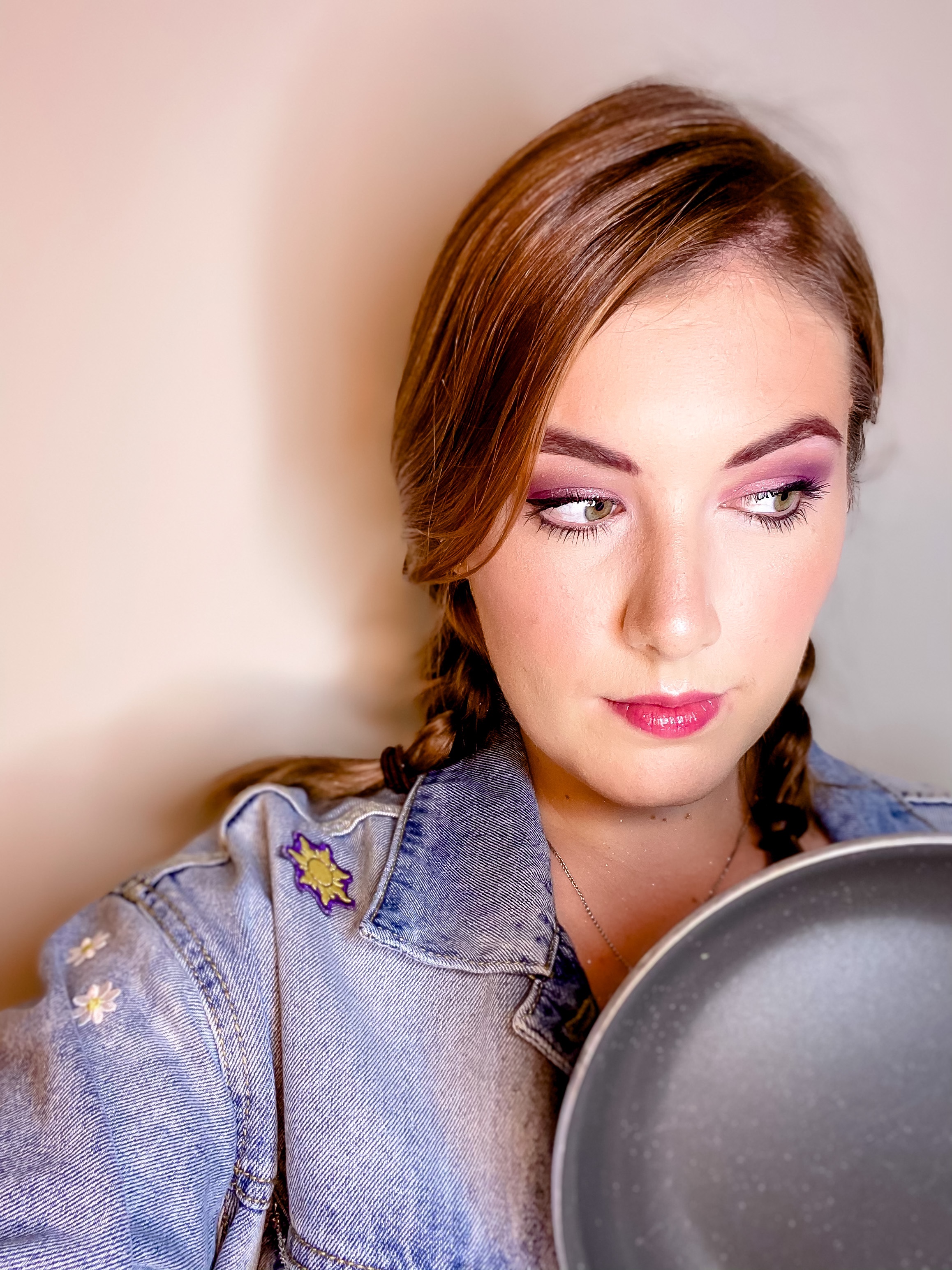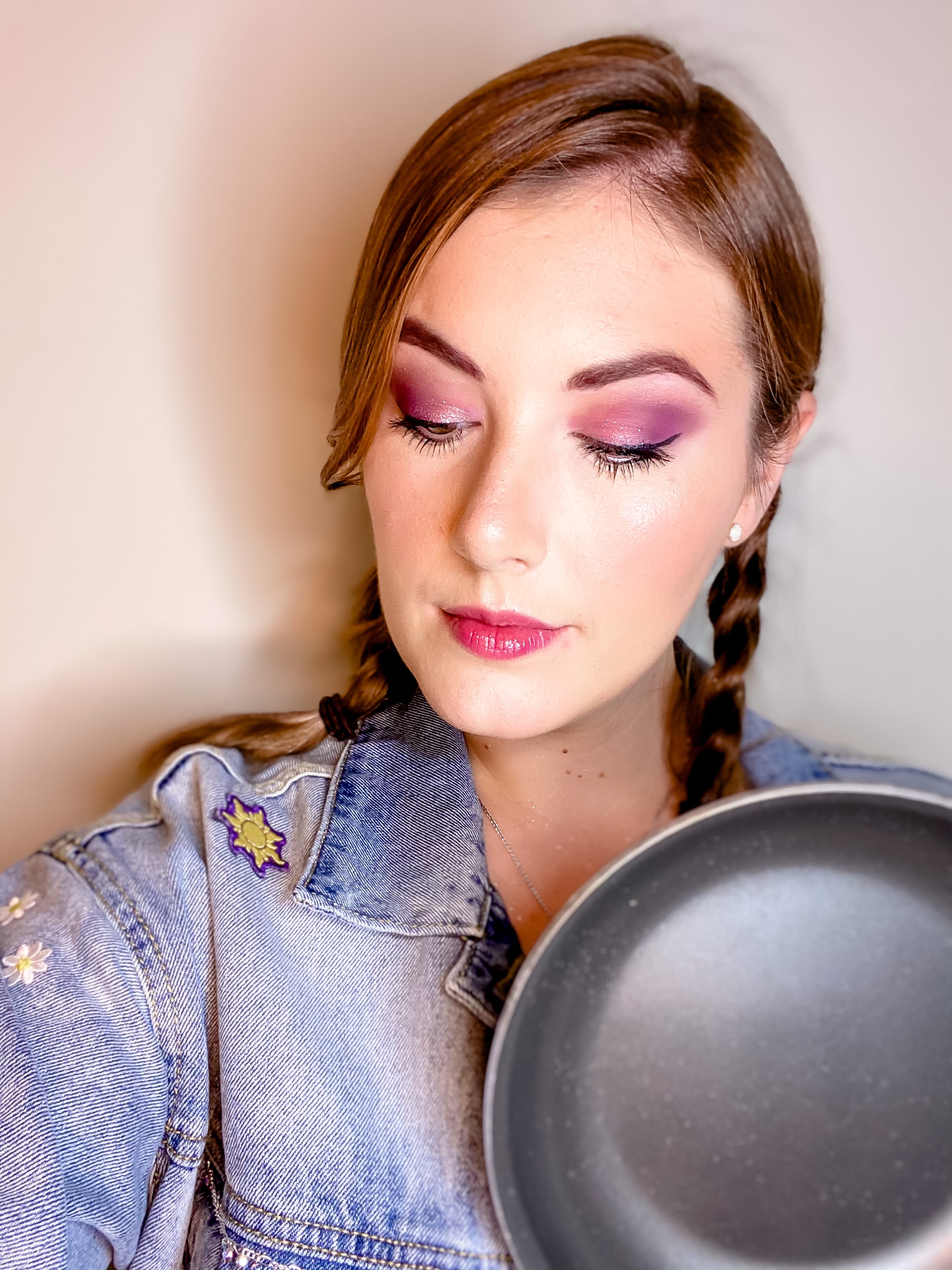 - Let’s start off with a classic, Disney Princess. When developing a makeup look for a Disney character my recommendation is to focus on the colors of the princess. Instead of recreating Rapunzel exactly, my idea was Rapunzel inspired. This is definitely an easy look anyone can do. After laying a base of foundation, concealer, and setting powder I went in with the eyeshadow. This is where those specific colors come in. For Rapunzel I knew I wanted purple and pink. Start by laying a neutral shadow in your crease, this will give you a safe base to start with when using more vibrant colors. After that I went in with the purple, again in the crease and then pink on the outer half of the lid. On the inner half of the lid I used a pink champagne glitter. Once your eyeshadow is done finish off with eyeliner and mascara. If you are not wearing a mask, definitely go in with a pink gloss. This really ties the makeup look together. If you are wearing a mask, skip the gloss and add your own spin. I chose a purple mask and added gold glitter in the shape of the Tangled sun to accessorize my look. Now grab your Rapunzel inspired costume, put your hair in braids, and wield your frying pan! Obviously all colors, items, and clothing can be swapped for different characters. Example: Cinderella – White Sparkle, Light Blue, Dark Blue. Moana – peach, tan, dark brown.