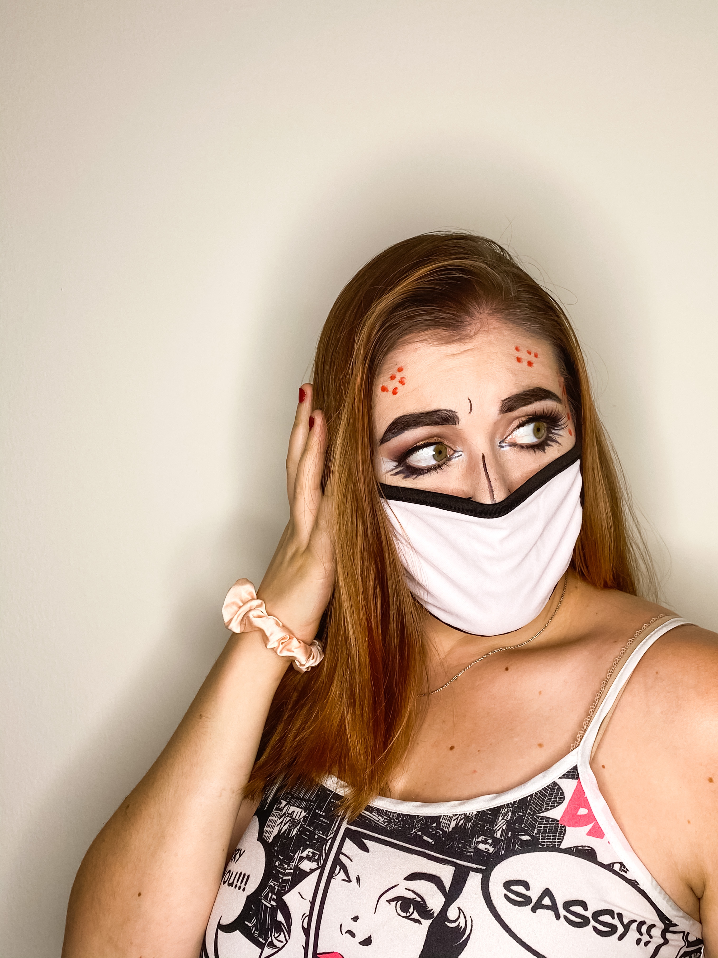 - For my fourth and final masked look I went back to Halloween a few years ago where I dressed up as a comic strip! So fun and pretty easy too. You can really do any kind of eyeshadow look you want, the most important element to this look are the black lines. I used a black felt tip eyeliner but you could also use a skinny brush and some black face paint. When choosing a mask I liked the look of a white one outlined in black, I think it made it pop off my face more. Another fun addition to this look are the comic dots. For this I took the back of my makeup brush, dipped it in some face paint, and stamped it on! If you are not wearing a mask make sure to line your lips in black and use a bright color to finish off the look.